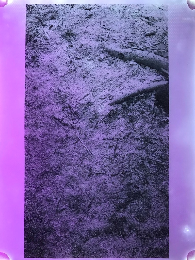 Starting from 5A: Sawdust Walker, I printed a grayscale version of the image on transparency paper two times, then placed one image reversed upon the other over a light board. The violet hue comes from a desk lamp, which I have set to that color.