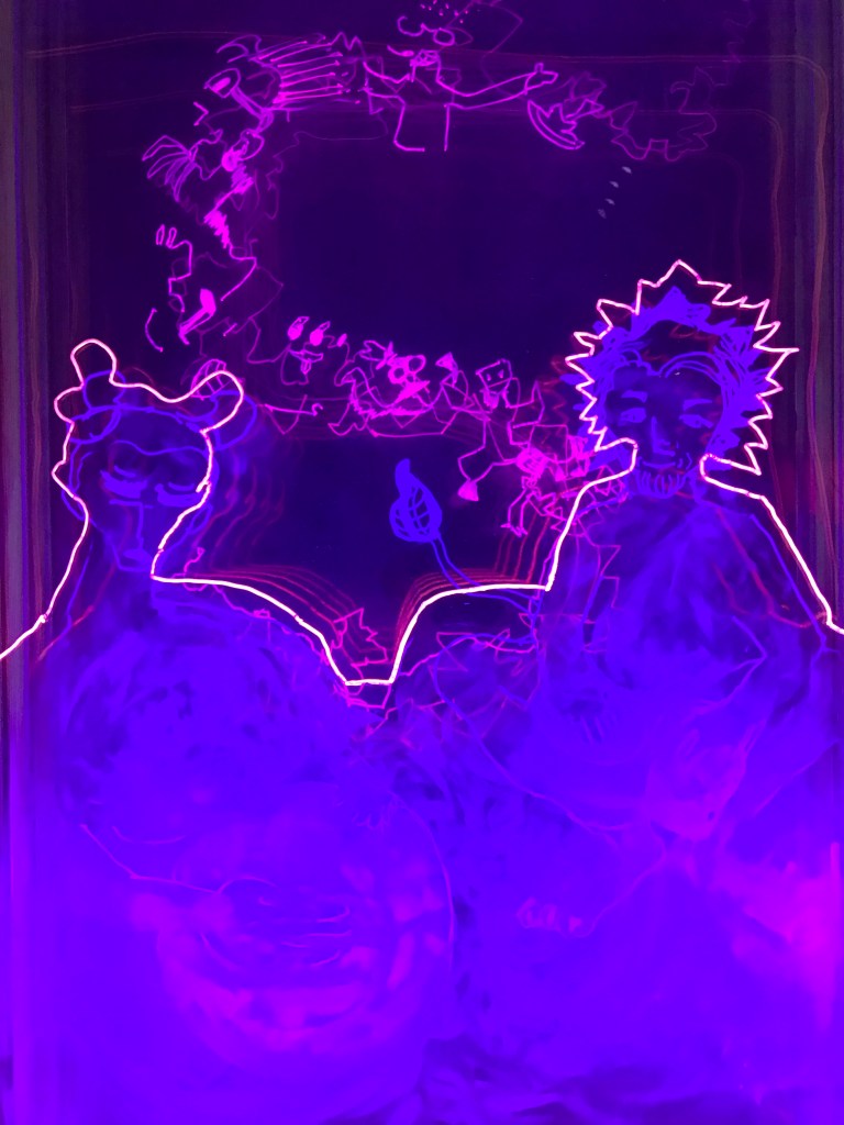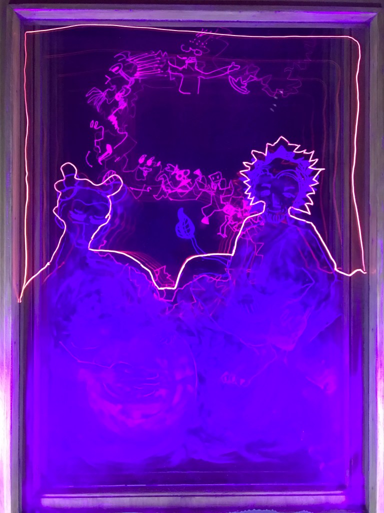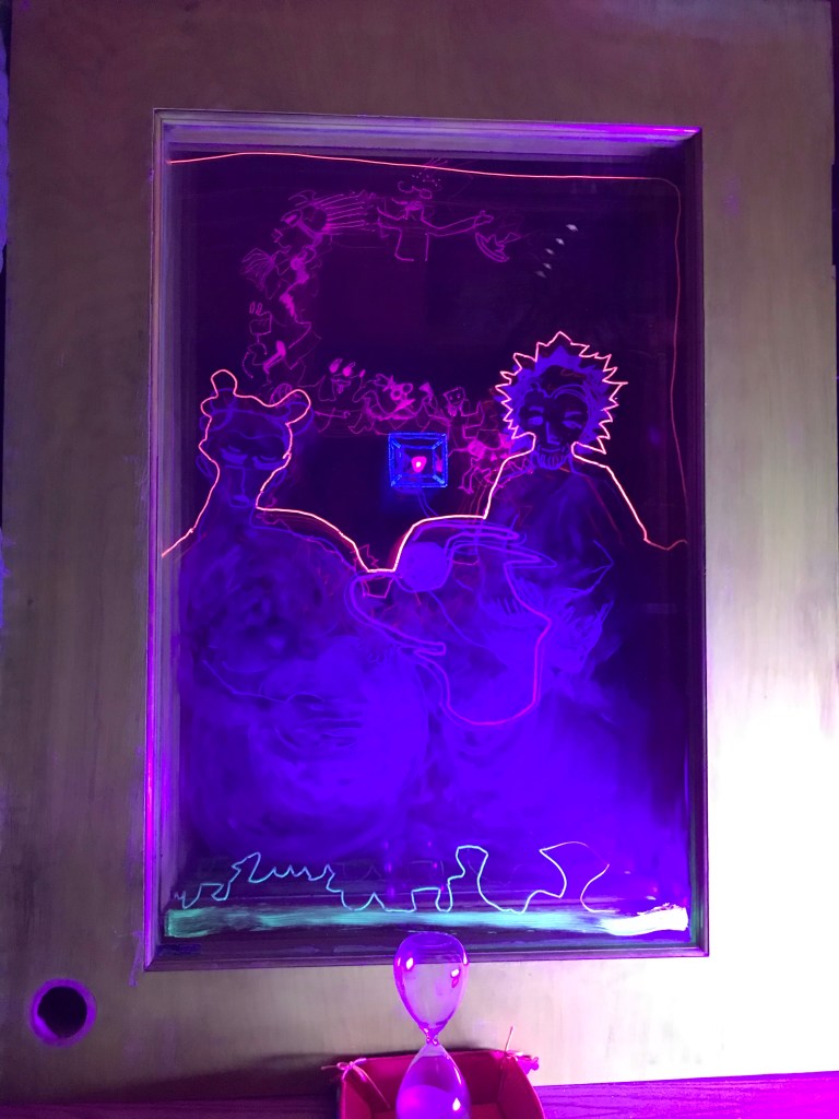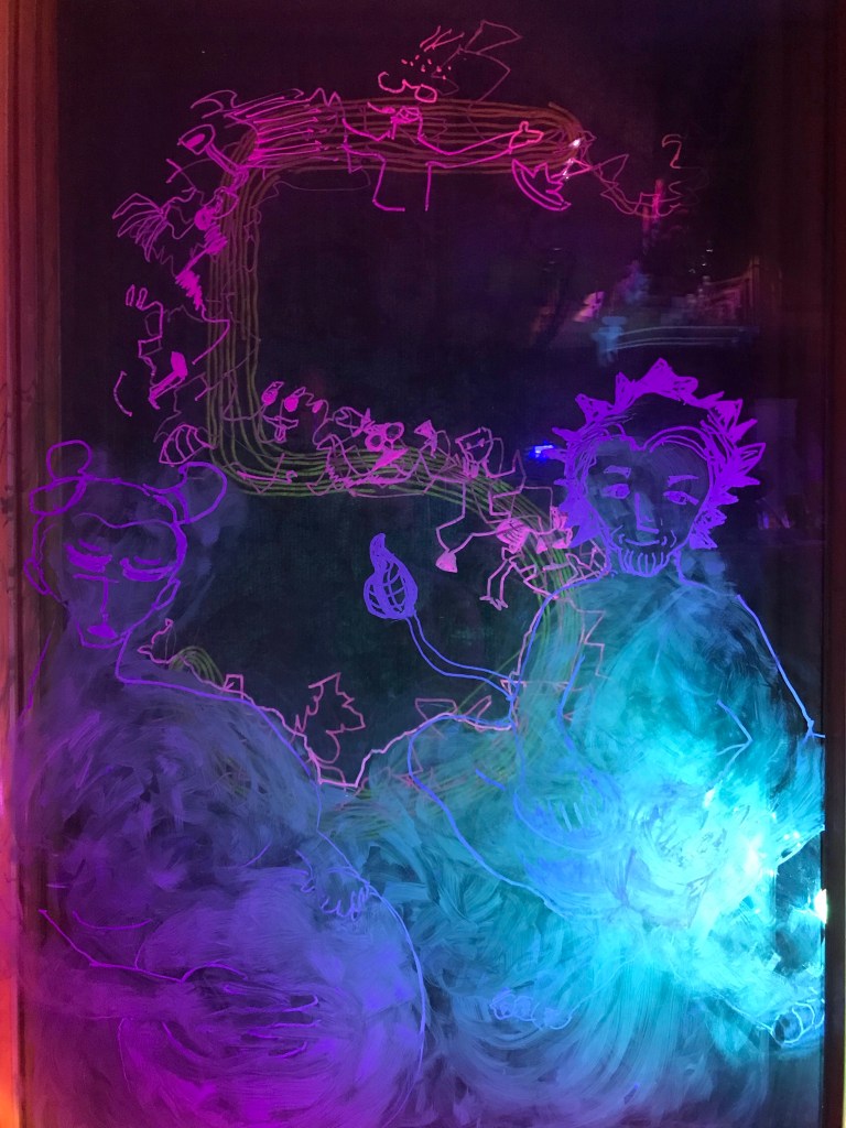 Medium: Yellow yarn on felt with added layers of liquid chalk and acrylic paint on glass illuminated by UV and LED light.